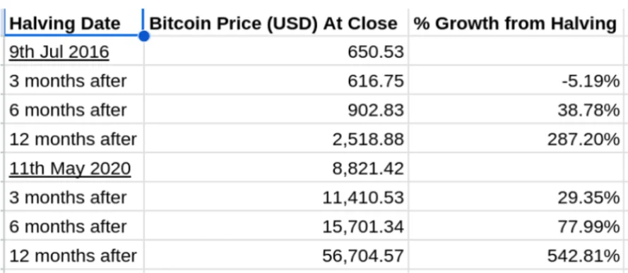 ビットコインの半減期は歴史的に非常に強気の兆候であったことは注目に値します。 2016年の半減期後の12か月間で、ビットコインは287%急騰しました。 パンデミックによる金融ブームの真っ只中、ビットコインは半減後の12か月で542%急増しました。 ビットコインがまだ初期段階にあったとき、2012年に最初の半減期が発生した後、1年で8,256%急増しました。