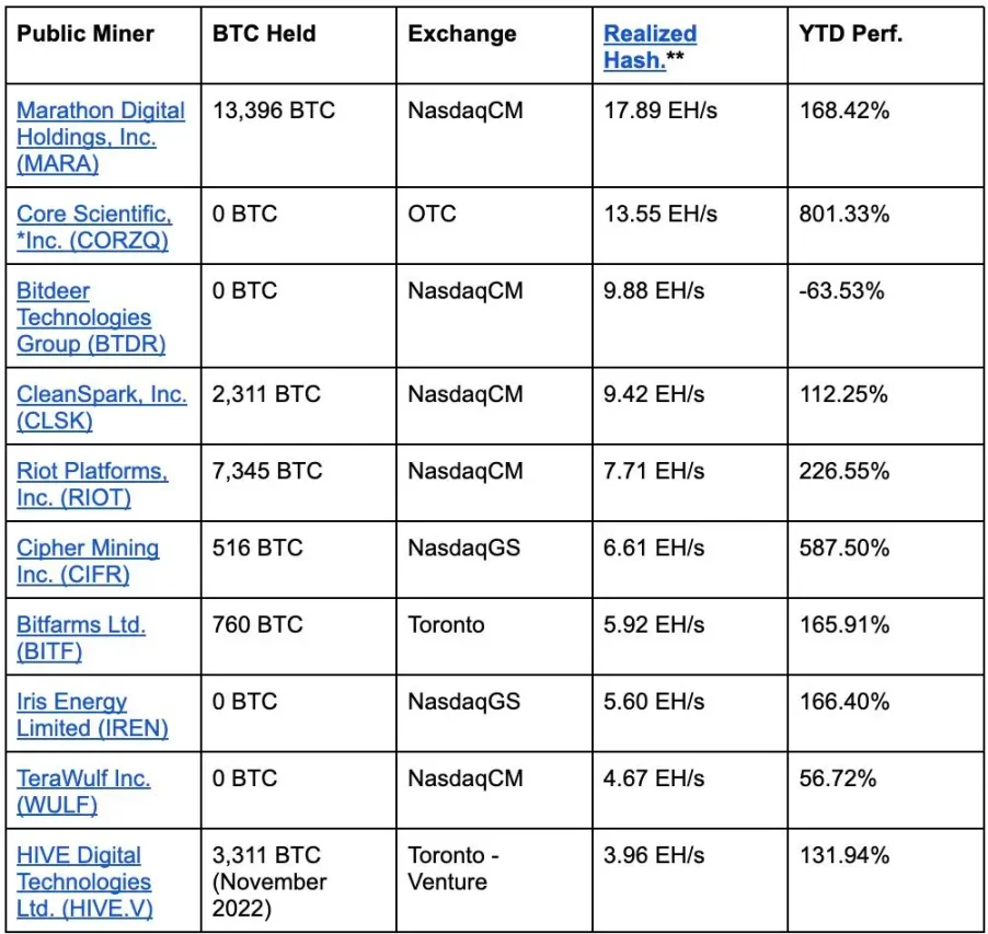 この軍拡競争は、毎年数百万ドルのコスト(特殊なハードウェアの調達、エネルギーコスト、間接費など)をもたらしたため、多くのマイナーがグローバルなサプライチェーンを持つ多国籍企業に進化しました。 実際、NASDAQやTSXなどの主要な株式市場に上場している主要マイナーは15社あり、いずれも2023年10月に0.5EH/s以上を達成しており、上位10社のマイナーは以下の通りです。