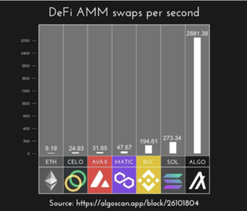 スマートコントラクトのスループットに関しては、下図に示すように、AlgorandはSolana、BNB Smart Chain、Avalanche、Polygon、Celo、Ethereumなどの他の主要なレイヤー1(L1)ブロックチェーンを上回っています。