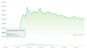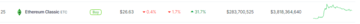 1月10日にSECがグレースケールビットコインETFを承認して以来、イーサリアムクラシックは驚異的な30%急騰を遂げ、現在約26ドルの取引価値を維持しています。 この急激な増加に伴い、取引量は270%増加し、18億ドルという大幅な成長を遂げました。
