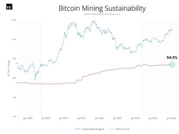 ビットコイン(BTC)鉱業における持続可能なエネルギー使用量は、2023年に過去最高の54.5%に達し、暦年を通じて3.6%増加しました。