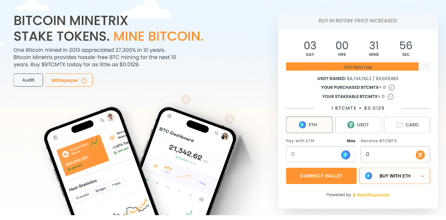 ビットコイン Minetrix($BTCMTX)も、現在の弱気相場から利益を得ているプロジェクトです。クラウドマイニングトークンのプレセールは、これまでに8,729,261を調達しました。