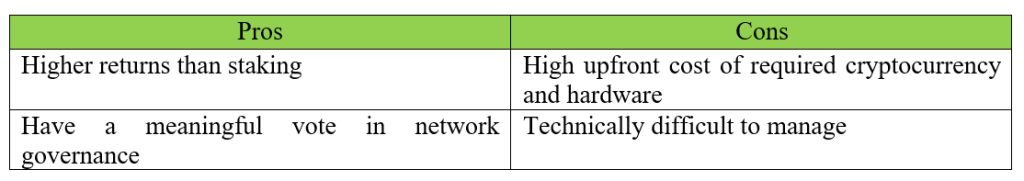 マスターノードを実行することで、ユーザーは特定のブロックチェーンネットワークのセキュリティに貢献し、報酬を得ることができます。マスターノードはリソースを多く必要とし、ハードウェアと仮想通貨への高額な投資が必要です。報酬も高くなる傾向があります。