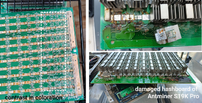 この問題の核心には、特にS19K ProモデルのAntminer S19シリーズのハッシュボード内部の重度の腐食があります。エアインレット側とハッシュボードの他の部分との間の明確な色の対比は、この腐食の具体的な現れであり、過酷なテキサスの気候によって悪化しています。