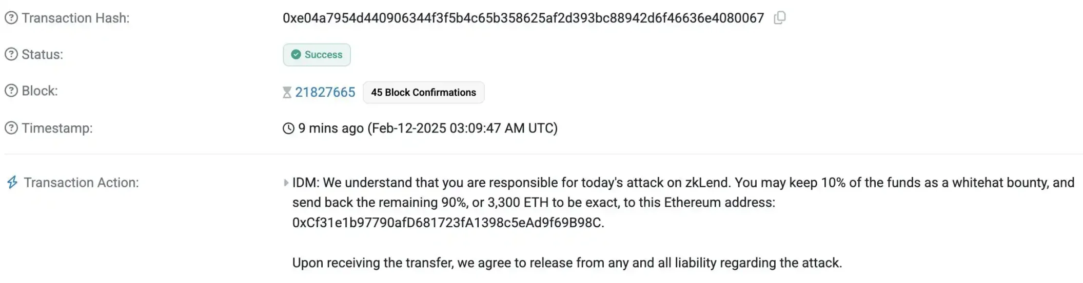 事件発生後、zkLend は残りの資金の安全を確保するために引き出しサービスを一時停止し、コミュニティに向けてチームが複数のパートナーと協力してハッカーの身元と資金流れを積極的に追跡していることを文書で表明し、透明性を維持し、最終的に詳細な調査分析レポートを公開することを約束しています。さらに、zkLend はハッカーが報奨金として10% の資金を残すことを提案し、残りの90%(3,300 ETH)をzkLend のイーサリアムアドレスに返金します。送金を受け取った後、攻撃に関連するいかなる責任も免除することに同意します。