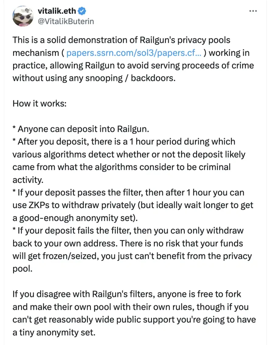 2 月 13 日、常に Railgun プラットフォームをサポートしているイーサリアムの共同創設者ビタリックがソーシャルメディアで投稿し、今回 Railgun が犯罪収益の処理を成功裏に回避した方法を専門に説明しました。
