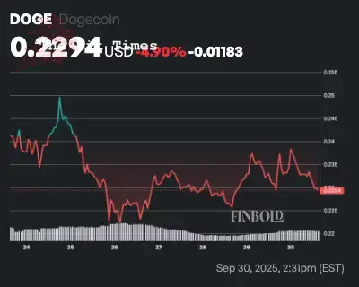 DOGE seven-day price chart. Source: Finbold**DOGE seven-day price chart. Source: FinboldMeanwhile, Dogecoin’s technical structure shows neutrality. At the current price, the token’s 50-day simple moving average (SMA) at $0.2351 serves as immediate resistance, signaling short-term consolidation
