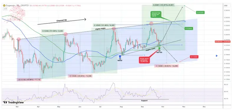 TradingShot**TradingViewDOGE price analysis chart. Source: TradingView**DOGE price analysis chart. Source: TradingViewThe analyst noted that recent price action has found support along the higher-lows trendline that emerged from the August 3 low, reinforced by the 100-day moving average (MA)