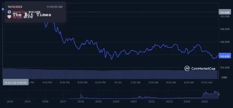 XRP مخطط السعر الأسبوعي. المصدر: FinboldXRP مخطط السعر الأسبوعي. المصدر: Finboldلقد انخفضت القيمة السوقية للأصل الرقمي من $167 مليار إلى $143 مليار في سبعة أيام فقط، مع محو ما يقرب من $8 مليار في الـ 24 ساعة الماضية فقط.