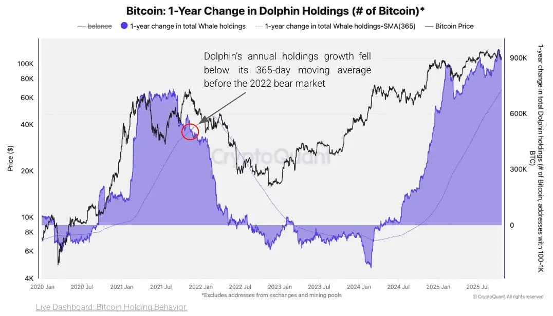 Дані у блокчейні CryptoQuant (23/10) показують, що цикл бичачого Біткойна переходить у фінальну стадію, але ще не закінчився. Група “Dolphin” — що складається з ETF, організацій та китів, які володіють 100-1.000 BTC — в даний час контролює 26% постачання ( приблизно 5,16 мільйона BTC) і відіграє ключову роль у ціновій дії.