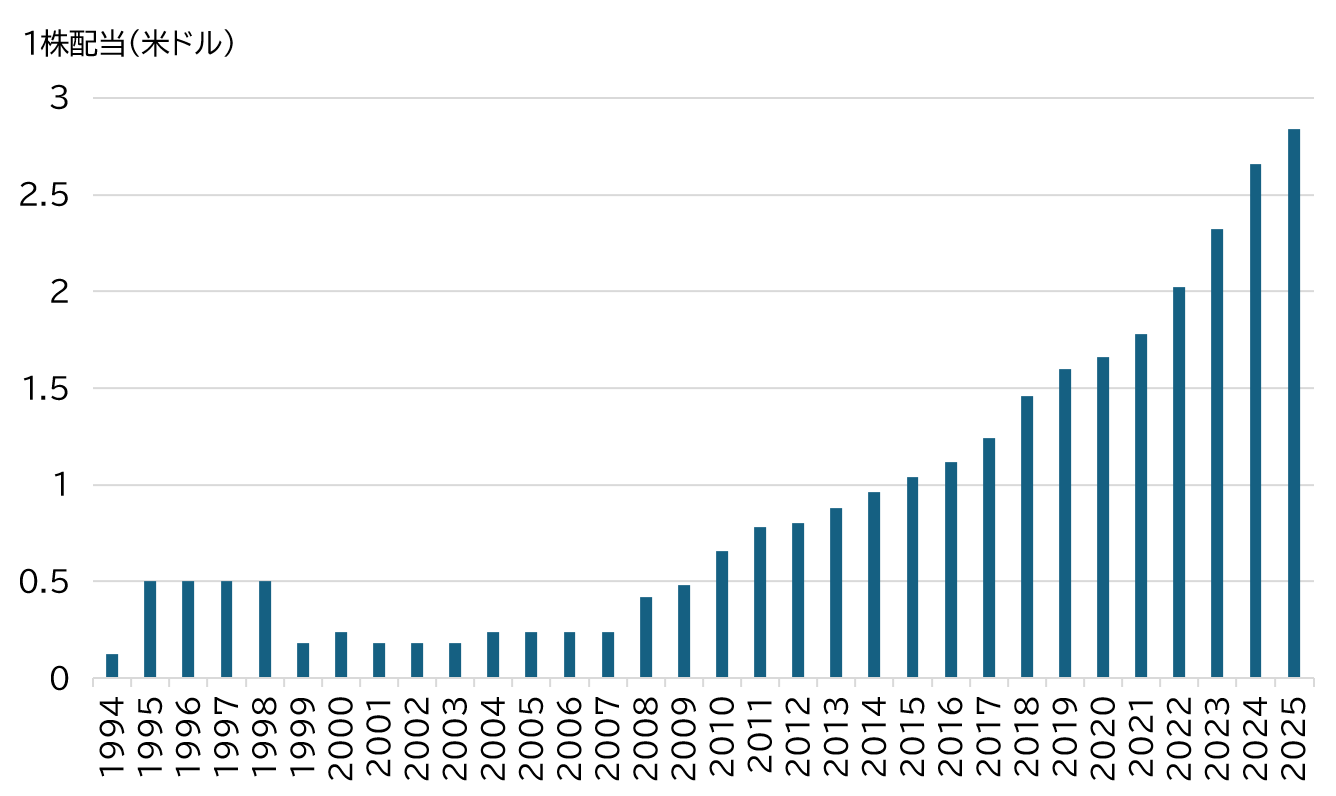 【図表1】マケッソン[MCK]年間配当推移 出所:Bloombergより筆者作成 ※1994年~2025年、2025年は予想値(直近四半期実績を通期換算)