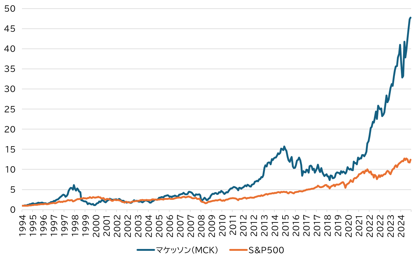 【図表2】マケッソン[MCK]とS&P500の株価推移比 出所:Bloombergより筆者作成 ※マケッソン[MCK]株価は1994年8月31日を1とした数値