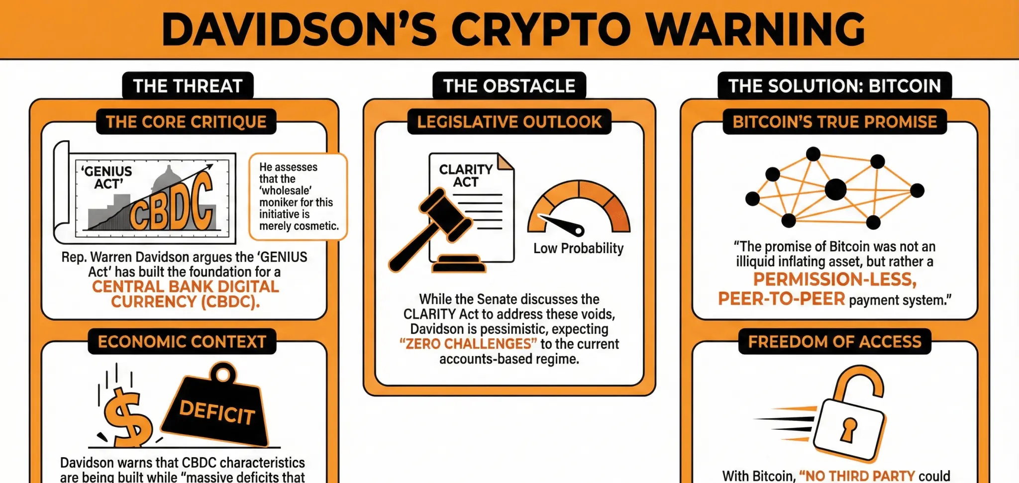 He views the GENIUS Act as laying the groundwork for a central bank digital currency (CBDC), criticizing it for cosmetic changes that ignore fundamental issues.