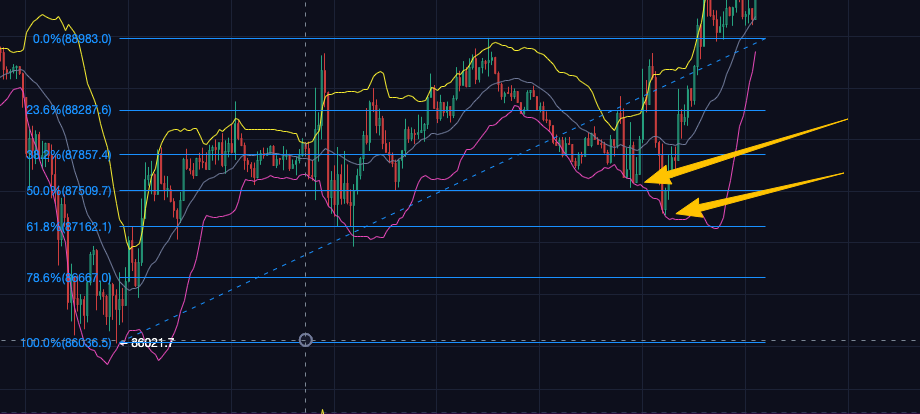glmos-code-explain昨晚给兄弟们的策略回顾: 🎯 BTC多単: 87200/87500分批接,87000 防御。 価格は正確にフィボナッチ0.618を下回った後、すぐに上昇し始めました。反発の勢いは非常に強力です!ついてきた兄弟たち、この波でしっかり利益を得られましたか?🍗