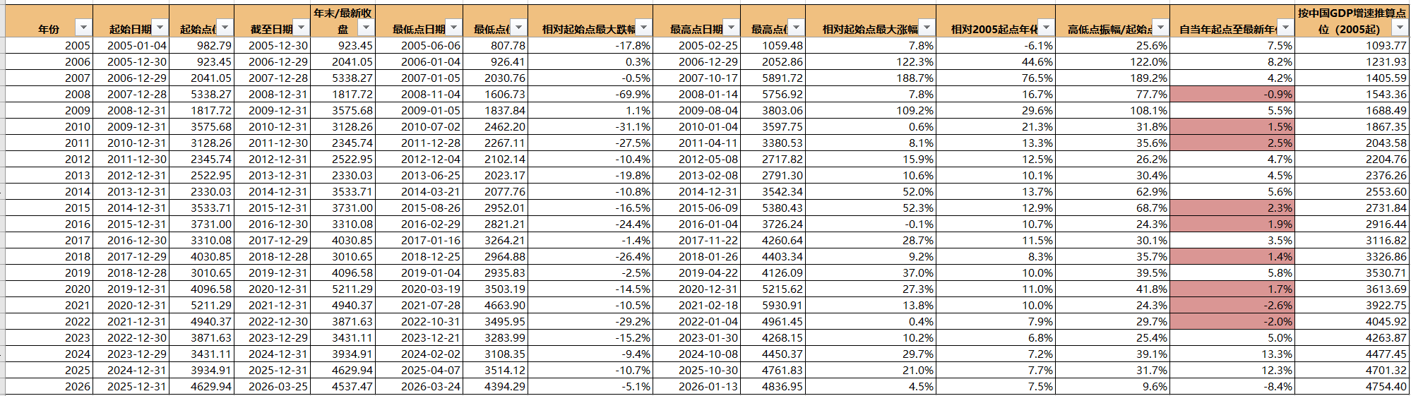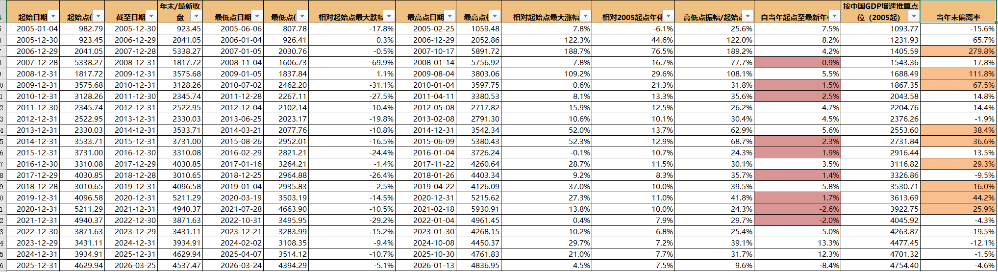 沪深300の売りオプション(プット)戦略を1年以上走らせていて、その間のドローダウンの変動などもかなり大きかった。指数は遅かれ早かれ戻ってくることは分かっているものの、実際には大きな下落に遭遇すると、やはり心のどこかで「今回だけは違うのでは」という不確実性が出てくる。 それで私は、沪深300指数はいったいどんな条件なら「合理的な価格」と言えるのかを考えた。AIに、05年に指数が立ち上がった時点から現在まで、毎年の点位の変化を走らせて、振れ幅も含めて見た。確かに概ね、振れ幅が20%を下回る年が多い。さらに、05年から投資を始めて、毎年末までのCAGRも計算させた。加えて、毎年の期首から投資を始めた場合に、現在まででどれほどのCAGRになるかも調べた。 自分の戦略は、毎年1月1日にポジションを決めて以後は調整せず、行使価格だけを調整するものだ。05年開始以降を見てみると、確かに概ね当年末までのCAGRはプラスで、それなりに良い年もある。だが、中間のある年から年初に投資を始めると、運が悪いようで、投資を始めた年から現在までのCAGRが3%を下回る年がかなり多い。かなり低いように見える。もちろん理由はシンプルで、そのときの点位が高かった、ということだ。  だから私は、沪深300は中国でも最大級の上場企業のまとまりであり、上場という語を外してしまってもよいくらいだと思う。するとそれらの通常の上昇幅はGDPとほぼ同程度であるはずだ(GDPは社会の平均的な伸びだと仮定する)。ところが意外にもおもしろいことが分かった。05年の年初から始めて、毎年末がGDPの増加率で算出される理論上の年末点位と、毎年末の実際の点位との間には、非常に緊密な裏付けがある。概ね、そうした年末点位が、私が設定したバリュエーションのアンカー(評価の錨)に対して%で示す超過が多すぎる場合(20%を超える。近い年では15%を超えることが多い)、翌年末までに投資を始めても、年化データがあまり良くないのだ。  図にするとさらに分かりやすい  つまり、毎年末にポジションを定める戦略は、かなりシンプルにできると感じている: 1)年末の終値の点位が、バリュエーションのアンカーからどれだけ乖離しているかを見る。15%を超えているなら慎重にして、株式(エクイティ)ポジションを下げるか、基本的には投資しない。回帰するまで待つ。 2)年中にブラックスワンや各種のグレーなサイが出ても、パニックにならない。いずれ必ず回帰するのだから、証拠金(マージン)管理をしっかり行う。 3)最近の数年で、終値の点位とバリュエーションのアンカーの乖離が拡大しており、さらにバリュエーションのアンカーを近20%ほど下回ることさえある点にも目を向ける。だから毎回、バリュエーションのアンカーを大幅に上回る局面では、必ず忍耐強く待つ。少なくとも回帰後に買い、その際、買い始めのポジション規模は大きすぎないようにする。 4)いまは長期目線で見ているので、年末の点位だけでなく、毎年の期首に対する相対的な点位も見る。上下の振れ幅は確率的に20%を超えるはずだから、その年初には、下方向に20%を割るという極端なケースに備えて証拠金を用意しておく。 以上は、自分なりの分析のまとめであり、自分の今後の戦略を実行するときに安全ベルトを付けるための一種の措置でもある。大きく下げたときも大きく上げたときも、その後の操作が何かを知っておく必要があり、「下げたからといって恐慌に陥る」ことも「上がったからといって楽観しすぎる」ことも避けたい。 長く実行できればと思う。以上、共に励みましょう!