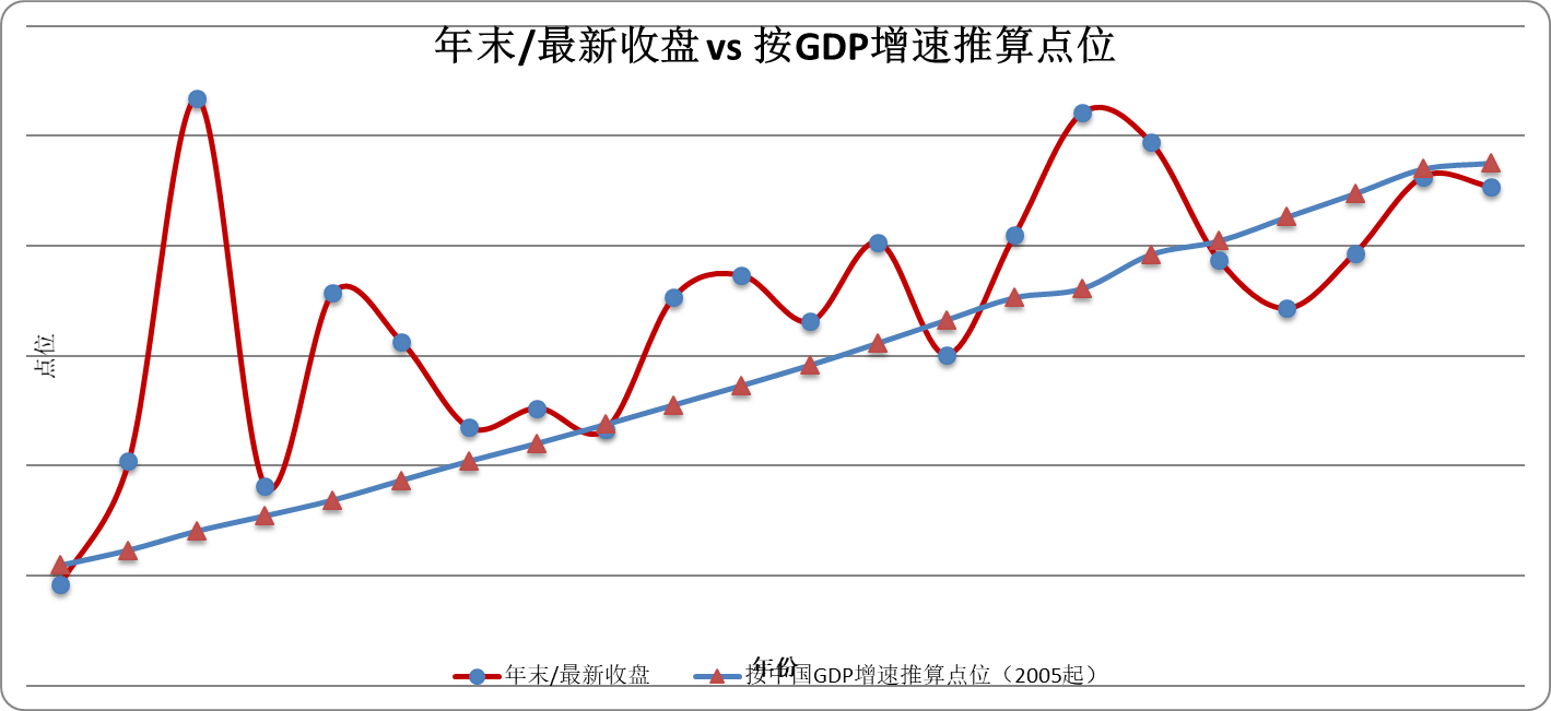 だから私は、沪深300は中国でも最大級の上場企業のまとまりであり、上場という語を外してしまってもよいくらいだと思う。するとそれらの通常の上昇幅はGDPとほぼ同程度であるはずだ(GDPは社会の平均的な伸びだと仮定する)。ところが意外にもおもしろいことが分かった。05年の年初から始めて、毎年末がGDPの増加率で算出される理論上の年末点位と、毎年末の実際の点位との間には、非常に緊密な裏付けがある。概ね、そうした年末点位が、私が設定したバリュエーションのアンカー(評価の錨)に対して%で示す超過が多すぎる場合(20%を超える。近い年では15%を超えることが多い)、翌年末までに投資を始めても、年化データがあまり良くないのだ。