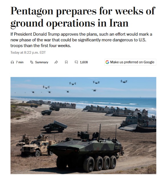 U.S. media reported on March 28 that, according to anonymous American officials, the Pentagon is preparing for “ground operations lasting several weeks” in Iran.