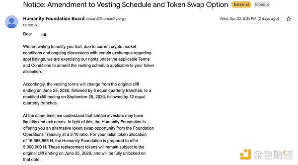 Humanity Foundation recently made significant adjustments to the $H token ownership plan for investors. The original unlock schedule, set to launch on June 25, 2026, with releases over 6 quarters, now requires a response via email before 09:00 UTC on April 26, and a final choice must be made between the following two options: