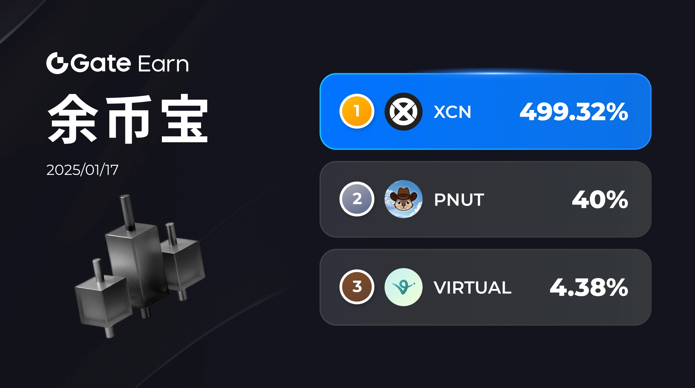 Gate 余币宝支持 XCN/PNUT/VIRTUAL 借出,年化收益率今日触及 499.32%