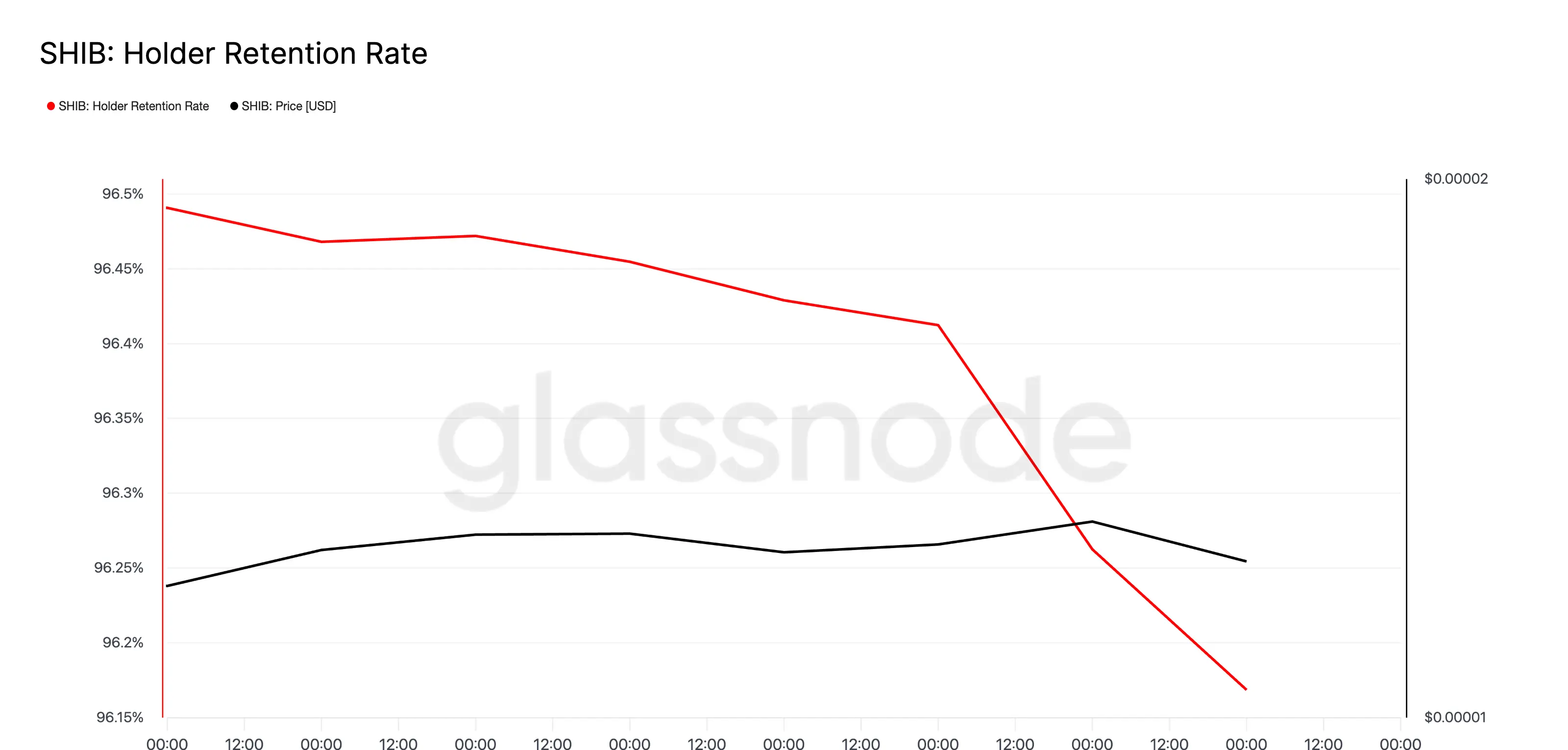 Os dados on-chain confirmam o crescente ceticismo entre os investidores. De acordo com plataformas de análise, a Taxa de Retenção de Detentores do SHIB tem diminuído constantemente ao longo da última semana e agora está em um mínimo de 53 dias de 96,16%.