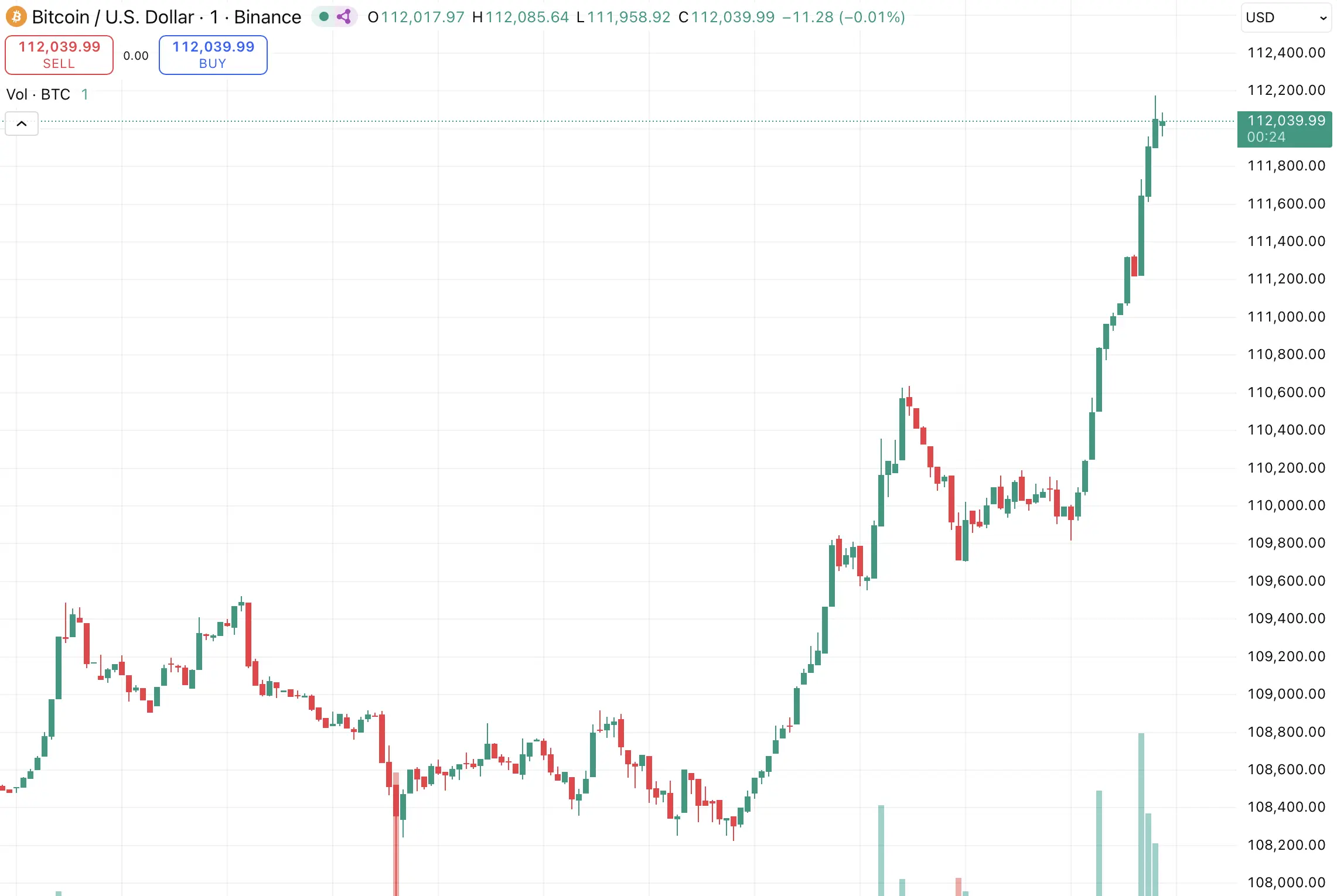 No gráfico de 1 minuto, o Bitcoin apresenta uma clara quebra de um padrão de cunha estreita, impulsionada pelo aumento da demanda à vista e pela redução da pressão de venda em várias bolsas principais. O movimento ascendente limpo de $109,000 para mais de $112,000 em poucas horas sugere uma quebra de acumulação, com os traders a observar $114,000–$116,000 como a próxima faixa de resistência.