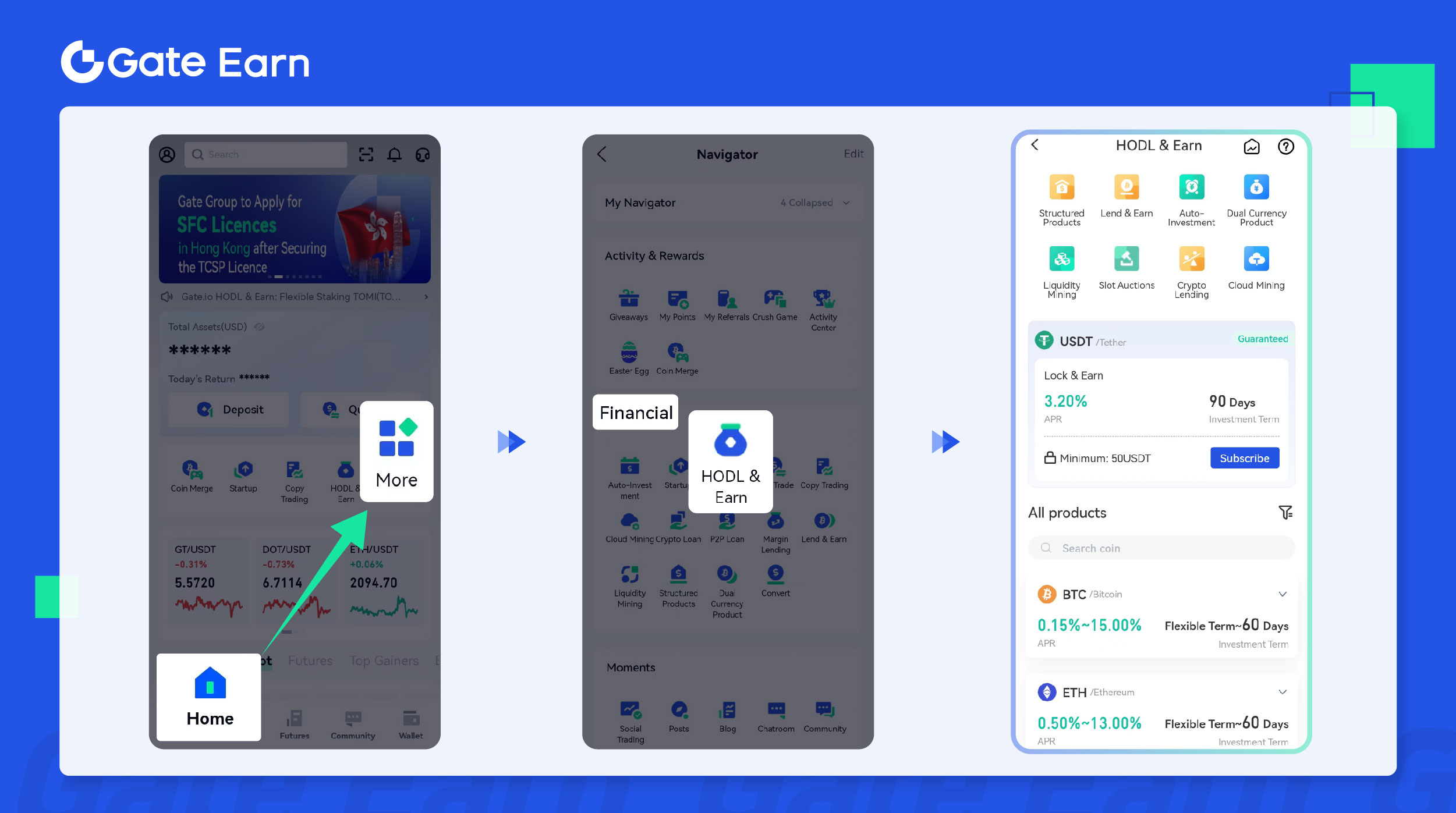 On APP, click Markets - More - Hodl & Earn - All Products to access the products.