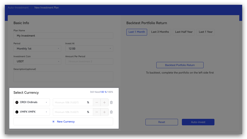 Go to the AutoInvestment homepage > Click on "New Investment Plan" > Find "Select Currency."