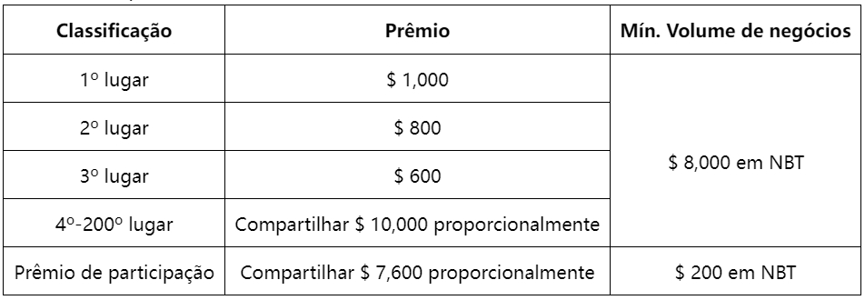 Todos os usuários qualificados com base no volume de negociação podem compartilhar $ 20.000 no NBT.