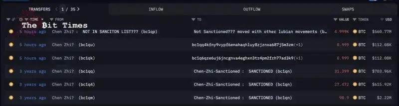No entanto, o detalhe mais chamativo não está apenas no passado. Apenas algumas horas atrás, a Arkham sinalizou um movimento de 4.999 BTC, no valor de mais de $560 milhões, de um endereço conectado a Chen. O que inquietou os analistas é que esta carteira ainda não estava na lista oficial de sanções, ecoando os fluxos associados ao infame sindicato LuBian no início deste ano.
