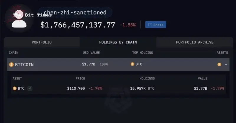 Esta semana, as autoridades dos EUA sancionaram-no pelo seu papel na orquestração de vastas operações de “abate de porcos” no Sudeste Asiático, onde supostamente foram utilizados complexos de trabalho forçado para defraudar vítimas em todo o mundo. Os dados da Arkham confirmam a escala da sua fortuna digital: endereços ligados a Chen detêm quase 15.957 Bitcoin, no valor de cerca de 1,77 mil milhões de dólares a preços atuais.