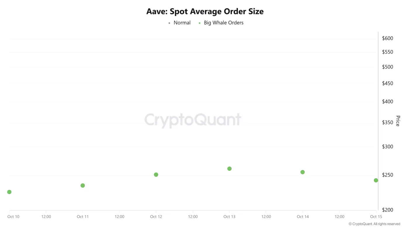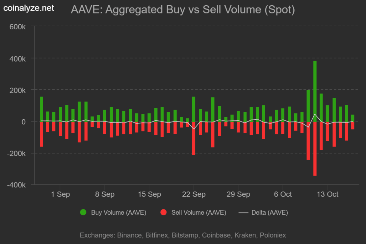 Especificamente, no dia 17/10, o volume de vendas atingiu 48.000 AAVE, enquanto o volume de compras ficou em apenas 46.000 AAVE, criando um delta negativo de -1,34 mil — um sinal de que a pressão de venda está claramente dominando o mercado à vista.