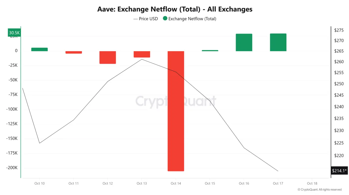 Fonte: CoinalyzeA evolução nas exchanges também reforça este quadro negativo. De acordo com os dados da CryptoQuant, o fluxo líquido de depósitos (Exchange Netflow) do AAVE manteve-se positivo por três dias consecutivos, com um total de cerca de 30.000 AAVE depositados na exchange.