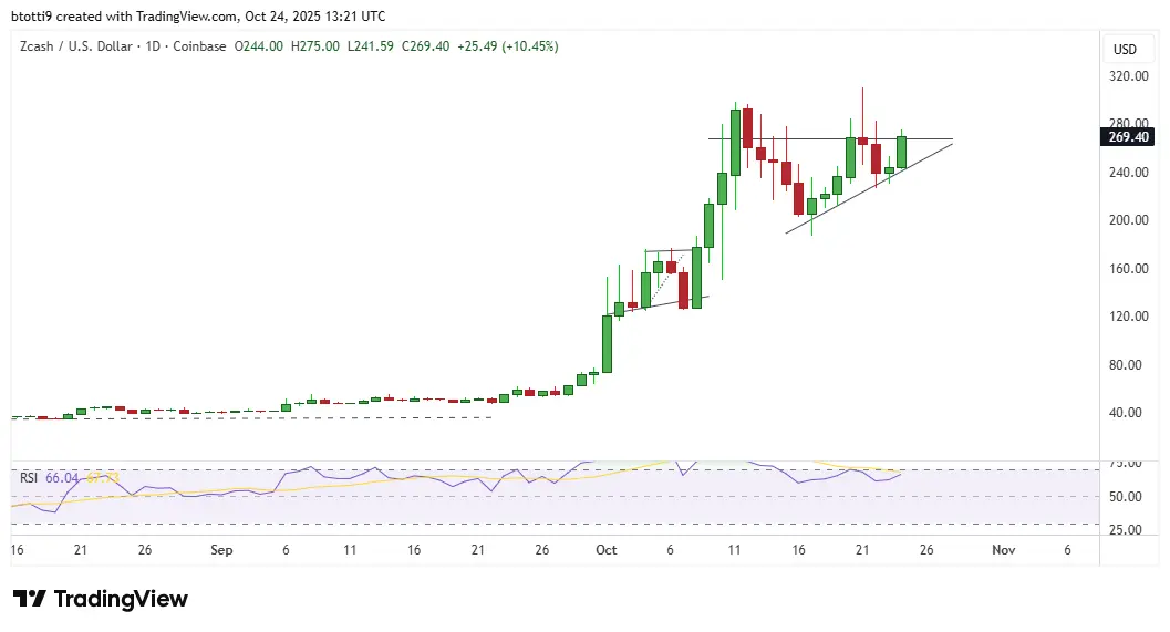 O reteste de $270 vem após uma recente queda que se seguiu ao rally do Zcash a máximas perto de $300 em duas ocasiões no mês passado.