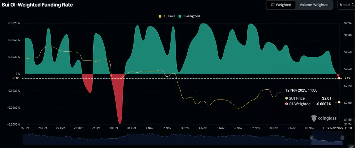 Contrato em aberto da SUI | Fonte: TradingViewAlém disso, a taxa de funding rate caiu para -0,007% no momento em que este artigo foi escrito, indicando que cada vez mais traders estão apostando em posições de venda (Short), aumentando assim a pressão de venda no mercado.
