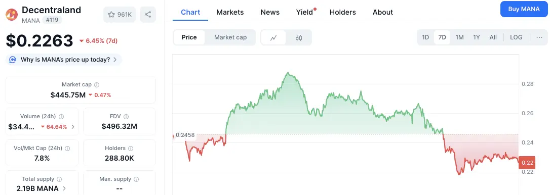 Da mesma forma, o preço do (MANA) da Decentraland caiu mais de 6% esta semana, agora negociando perto de $0.226. O token está testando uma área de suporte crítica em torno de $0.22, onde os compradores estão tentando estabilizar a queda. Uma recuperação decisiva acima de $0.25 poderia restaurar o momentum, enquanto a falha em manter $0.22 pode expor $0.20 como o próximo nível chave.
