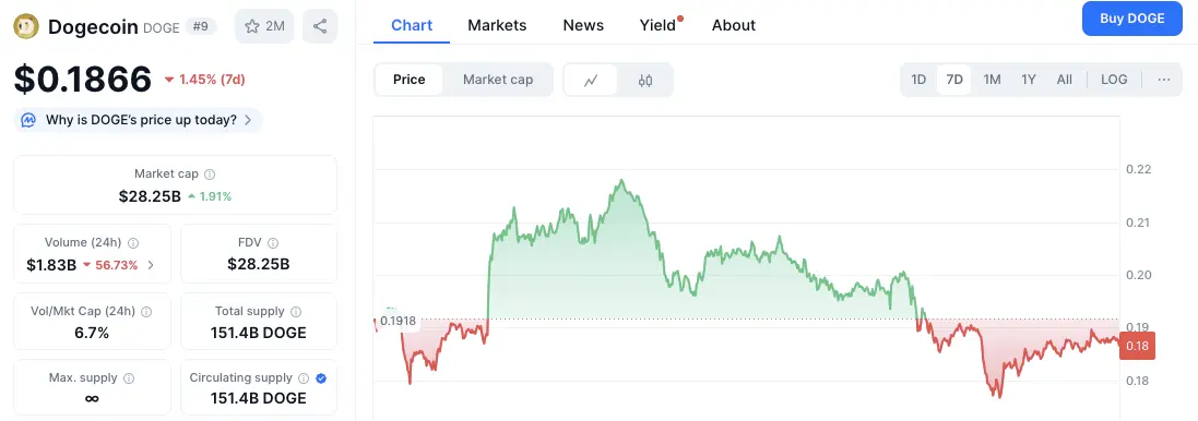 Dogecoin (DOGE) também permanece sob pressão, caindo 1,45% para $0,1866. O suporte chave em $0,18 continua a se manter, embora o momentum tenha diminuído desde a sua ruptura falhada acima de $0,21. Um fechamento forte acima desse nível mudaria o sentimento de volta para otimista e poderia mirar em $0,24.