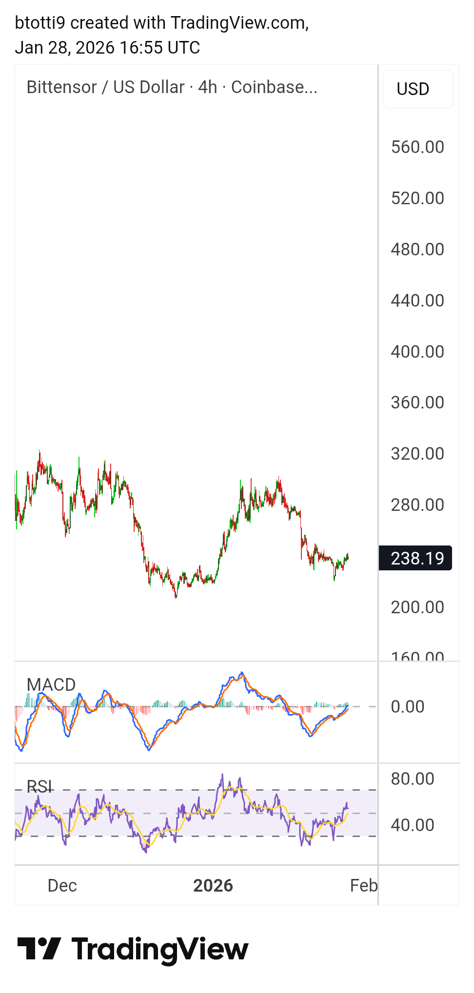 No gráfico de 4 horas, a Bittensor apresenta indicadores de impulso positivo, incluindo recuperação do RSI e MACD.