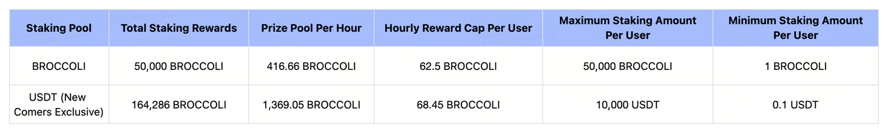 (3)Пользователи могут присоединиться к BROCCOLI и USDT Пулам стейкинга одновременно, чтобы получать вознаграждения от пула BROCCOLI и пула USDT отдельно.
