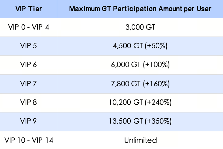 Пройдите верификацию личности и держите минимум 1 GT, чтобы разделить общий пул наград пропорционально вашему срезу владения GT. Для данного мероприятия лимит участия для пользователей VIP 0–VIP 4 составляет 3 000 GT. Пользователи VIP 10 и выше могут участвовать без ограничений.