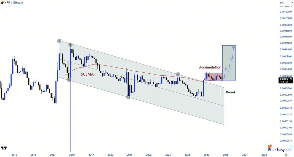 Если XRP/BTC сможет продолжать удерживаться выше уровня поддержки после прорыва и восстановить восходящее движение после бокового тренда, следующим целевым уровнем станет тестирование уровня сопротивления после прорыва канала. Исторический опыт показывает, что первая волна отскока после прорыва долгосрочного нисходящего канала часто сопоставима с вертикальной шириной канала. Это означает, что у XRP по отношению к BTC может быть значительный потенциал роста, и эта относительная сила также отразится на производительности XRP по отношению к ETH.