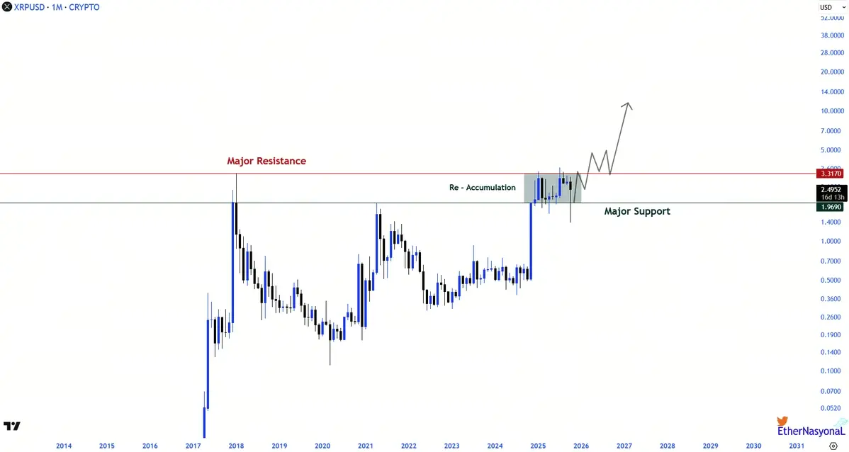 На графике XRP/USD этот актив продолжает колебаться между 2 и 3.3 долларами. Эти два уровня цен являются историческими максимумами 2021 и 2017 годов и имеют важное психологическое и техническое значение. Аналитик EtherNasyonaL отмечает, что XRP в настоящее время находится на этапе повторного накопления, который является одним из ключевых этапов рыночного цикла, описанных в теории Уайкоффа.