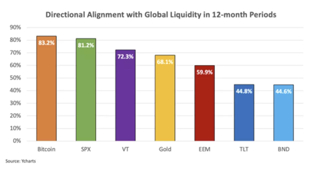 Согласно исследованию финансового аналитика Лина Алдена, биткоин исторически в 83% случаев двигался в соответствии с глобальной ликвидностью.