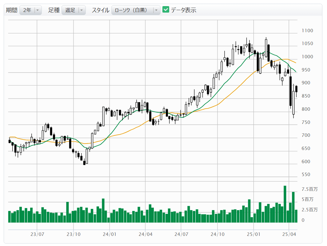 【図表6】Блэкрок[BLK]: недельный график (скользящие средние зелёный: 13 недель, оранжевый: 26 недель) ! Источник: веб-сайт Monex Securities (по состоянию на 18 апреля 2025 года)