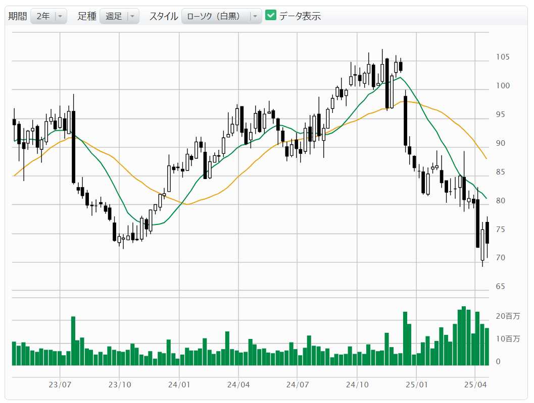 【図表8】Omnicom Group[OMC]: недельный график (скользящие средние зеленый: 13 недель, оранжевый: 26 недель) ! Источник: веб-сайт Monex Securities (по состоянию на 18 апреля 2025 года)