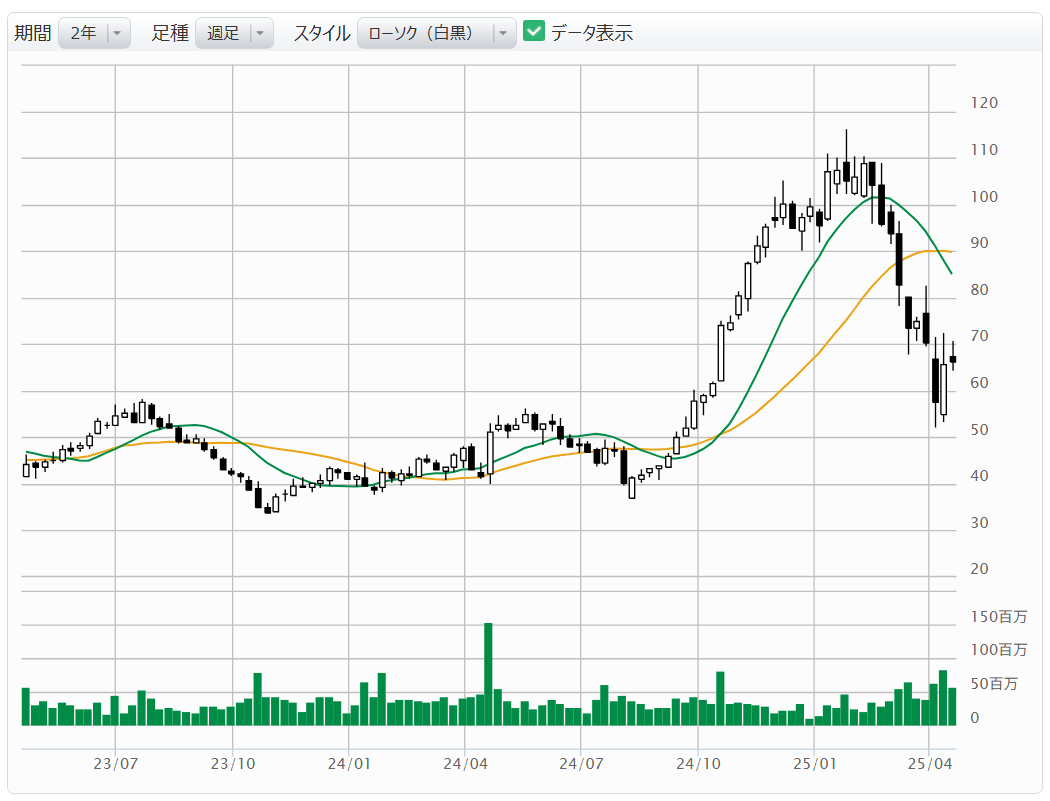 【図表10】United Airlines Holdings [UAL]: недельный график (скользящие средние зеленый: 13 недель, оранжевый: 26 недель) ! Источник: веб-сайт Monex Securities (по состоянию на 18 апреля 2025 года)