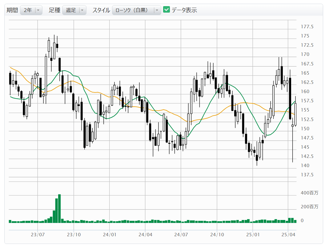 【図表2】Джонсон и Джонсон[JNJ]: недельный график (скользящая средняя зеленая: 13 недель, оранжевая: 26 недель) ! Источник: веб-сайт Monex Securities (по состоянию на 18 апреля 2025 года)