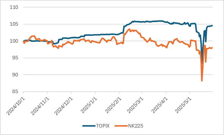 Сравнивая ожидаемую EPS (чистую прибыль на акцию) Nikkei Average и TOPIX со 100 на 1 октября 2024 года, EPS Nikkei еще не вырвалась из нисходящего тренда с момента достижения пика в феврале, в то время как EPS TOPIX почти вернулась к своему максимальному уровню и находится выше, чем прошлой осенью.