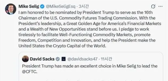 25 числа ( местного времени ) Майк Селиг заявил через свой аккаунт X ( ранее Twitter ): “Я рад быть номинированным Президентом Трампом на должность 16-го председателя CFTC.”