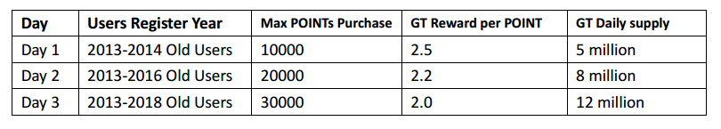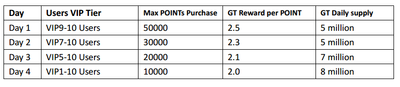 (7) Users can purchase POINT on any specific day or several days during the distribution (please note that the amount of GT reward will reduce over time). After UTC 6:00, we will collect all the qualified orders and distribute the POINT and GT reward according to the individual purchased plans: total purchased plans ratio. The final result will be announced at UTC 8:00 each day.