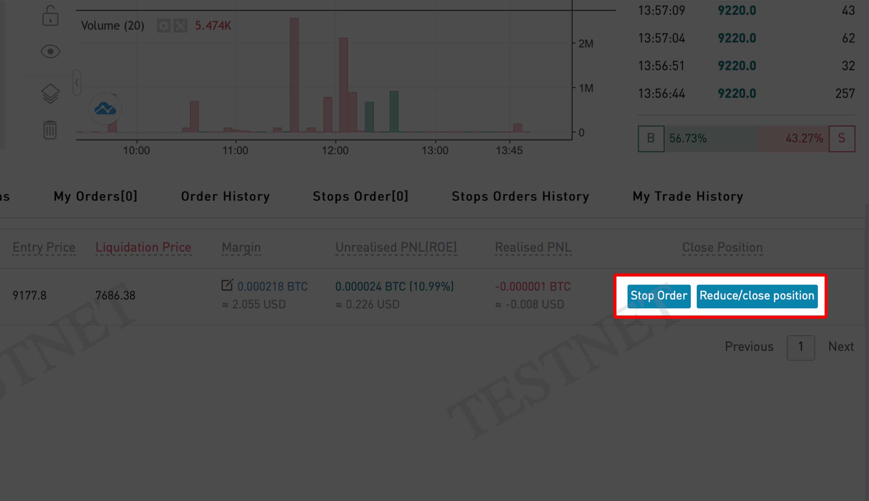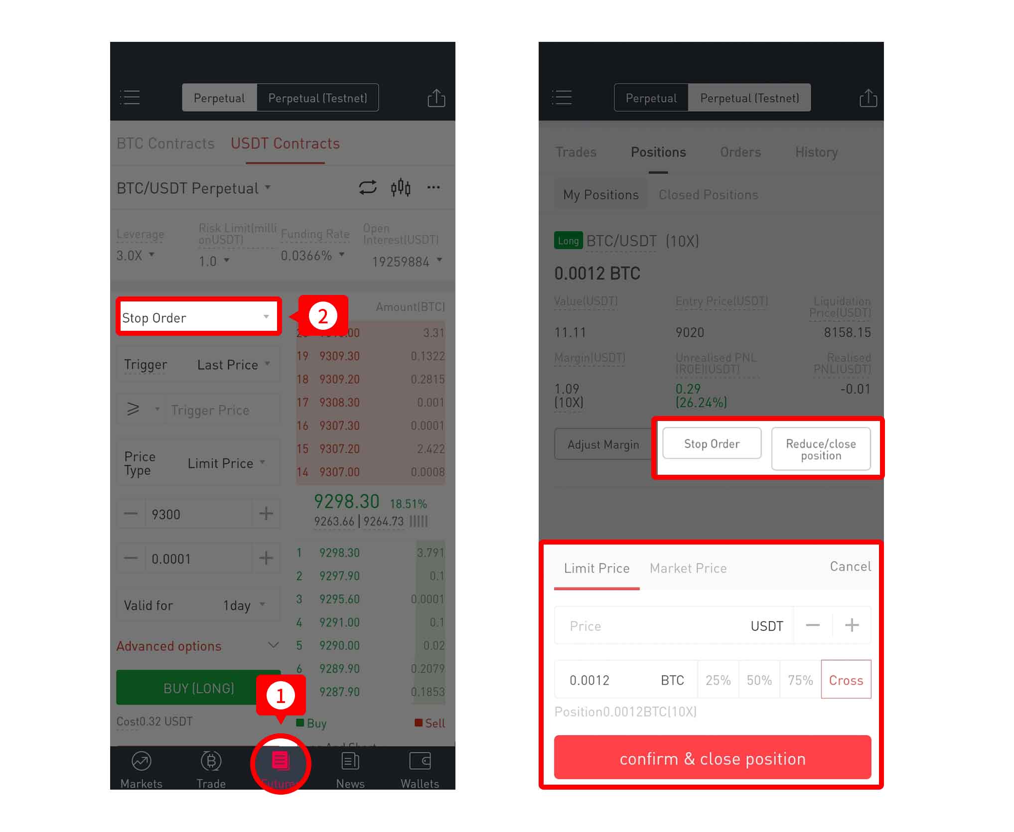 After opening a position, click “Stop Order” under “Positions”to sell or close a position. To sell or close a position, users can choose limit price or market price. For the proportion of selling a position there are options of 25%, 50%, 75% and fully closed.